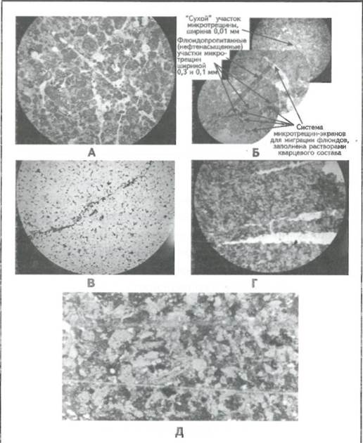 повышенная сквозная по разрезу трещиноватость (по данным керна) и микротрещиноватость (в петрографических шлифах) пород продуктивных горизонтов. Наблюденные микротрещины разной генерации (ориентировки), раскрываемости (шириной 0,01-0,30 мм), степени заполнения (полностью или частично заполненные, открытые) и различного состава заполнения (глинистым, кварцевым или другим материалом, нефтенасыщенные) (рис. 5).