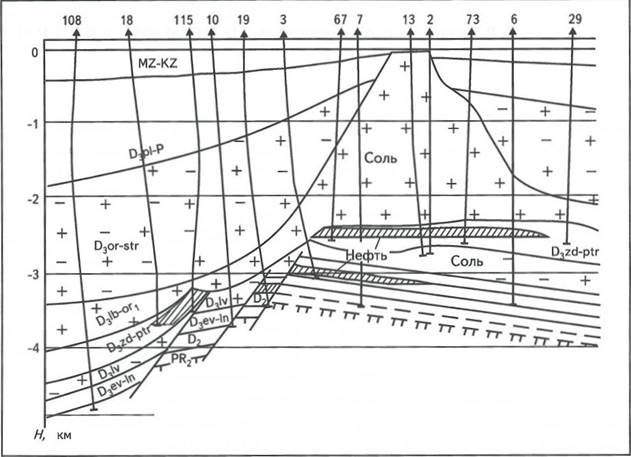 В центральной части прогиба, в интервале пикетов 30-150, закартированы также два купола, постседиментационный (пикеты 30-90) и конседиментационный (пикеты 90-150). Несмотря на то, что первый имеет меньшую высоту, перекрывающие его осадочные отложения вблизи контакта и в надкупольной части соляного штока обнаруживают четко выраженную инъективную складчатость. Причем признаки диапиризма прослеживаются вверх по разрезу намного выше, чем высота соседнего конседиментационного соляного купола. Над последним перекрывающие осадочные отложения залегают спокойно, несмотря на наличие под ними более высокого и масштабного соляного купола (пикеты 90-150). Вмещающие породы, слагающие с перекрывающими отложениями единую непрерывную осадочную толщу, в интервалах соприкосновения с поверхностью соляного столба не обнаруживают каких-либо следов деформации, обязательно проявляющихся в виде складок и разрывов вблизи диапиров пластичных солей. Описанные особенности соотношения соляных куполов и вмещающих отложений установлены не только по материалам сейсморазведки, но и по данным глубокого и структурного бурения. Так, фаменский конседиментационный соляный купол высотой > 2 км не влияет на характер залегания вмещающих и перекрывающих отложений, повторяющих морфологические черты осадков подсолевого ложа (рис. 2).
