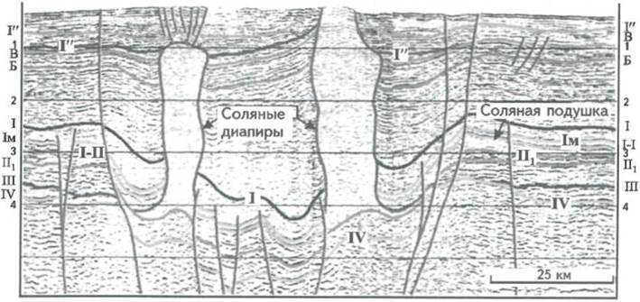 В пределах Прикаспийской впадины также установлено наличие двух разных групп соляных куполов. Первая прорывает триасовые отложения и способствует образованию в них интенсивных соляных дислокаций. Вторая круто пересекает слои прилегающих осадочных пород, не деформирует их, а спокойно перекрывается ими в кровле (Воронин Н.И., Осинский Г.Д., Круглов Ю.И., 1979). Описанные отличительные особенности днепровско-донецких и прикаспийских соляных куполов свидетельствуют об их принадлежности к выделенным двум генетическим типам - постседиментационному и конседиментационному.