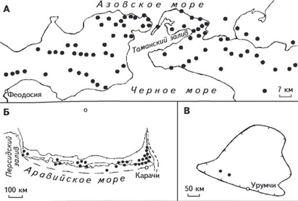В пределах грязевулканических областей с большим числом вулканов последние практически относительно равномерно разбросаны по всей территории. Такая картина отмечается в пределах Южно-Каспийской впадины, Керченско-Таманской области, на о-ве Тринидад (рис. 1, А, 2). В других грязевулканических областях наблюдается зональное распределение грязевых вулканов, которые концентрируются на территориях, удаленных друг от друга иногда на значительное расстояние. Подобное распределение грязевых вулканов отмечается в Омано-Макранской впадине (см. рис. 1, Б). Здесь на побережье Аравийского моря на протяжении около 1500 км располагаются пять групп грязевых вулканов, в каждой из которых от трех до тринадцати вулканов с расстоянием между ними от 70 до 200 км. Аналогичная картина отмечается в пределах Предараканско-Никобийского прогиба, где находятся 16 грязевых вулканов. Последние сконцентрированы на трех участках, расстояние между которыми около 500 км.