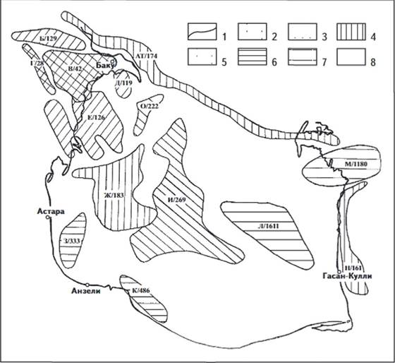 1 берег Каспийскою моря; зоны с различными площадями, приходящимися на один грязевой вулкан, км2: 2 < 50, 3 119-130,4 160-185,5 220-270, 6 330-490,7 >1000; 8 области с неустановленными грязевыми вулканами