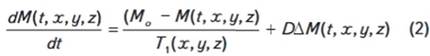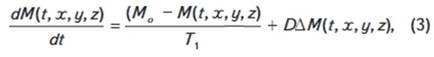 где М0 - равновесное значение намагниченности в поре; Т1(х, у, z) - время спин-решеточной релаксации компонент воды; D- коэффициент самодиффузии; Δ- оператор Лапласа.