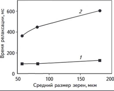 Рис. 1. ЗАВИСИМОСТЬ ВРЕМЕН СПИН-РЕШЕТОЧНОЙ РЕЛАКСАЦИИ КОМПОНЕНТ ВОДЫ ОТ СРЕДНЕГО РАЗМЕРА ЗЕРЕН МОДЕЛЬНЫХ ОБРАЗЦОВ
