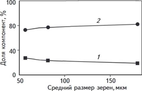 Рис. 2. ЗАВИСИМОСТЬ ПРОЦЕНТНЫХ ДОЛЕЙ КОМПОНЕНТ ВОДЫ ОТ СРЕДНЕГО РАЗМЕРА ЗЕРЕН МОДЕЛЬНЫХ ОБРАЗЦОВ
