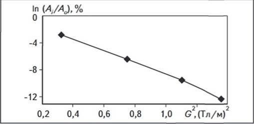На рис. 3 приведен график зависимости логарифма отношения сигнала эхо с градиентом магнитного поля к сигналу без градиента магнитного поля от квадрата градиента магнитного поля (график Стейскала-Таннера). Из прямолинейного характера графика следует, что подвижность воды в образце определяется одним коэффициентом самодиффузии, причем среднее значение коэффициента самодиффузии равно 2,24 • 10 -5 см2 • с-1. Данное значение соответствует коэффициенту самодиффузии воды при температуре 24 °С. Из изложенного следует, что вода в порах исследуемого образца имеет подвижность воды свободного объема.