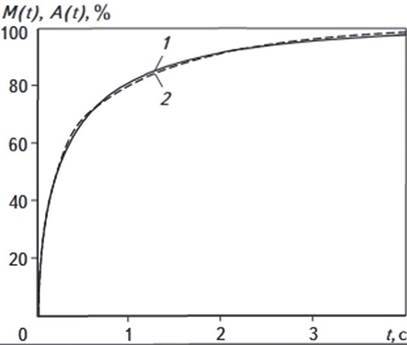 На компьютере вычислялись значения M(t) при D= 2,04*10-5 см2 *с-1 при температуре 20 °С [1], Т1 = 2,2 с и при различных значениях А, В, С. Полученные табличные значения M(t) аппроксимировались уравнением (1). Методом наименьших квадратов находились значения параметров а, b, T1(1) и T1(2). На рис. 4 показан пример сопоставления значений M(t) и A(t) при А = В = C= 50 мкм.