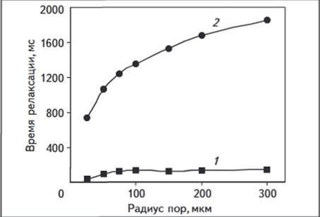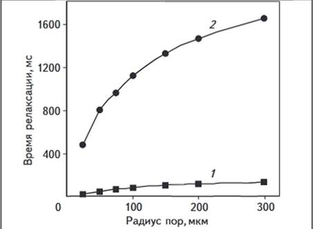 В [2, 3] придерживаются модели, согласно которой фаза жидкости с более коротким временем релаксации соответствует молекулам воды, находящимся в мелких порах, с длинным временем релаксации - молекулам воды в более крупных порах. При допущении заполнения пор одинаковой жидкостью и сходства свойств поверхности пор распределение времен релаксации характеризует распределение размера пор в образце.