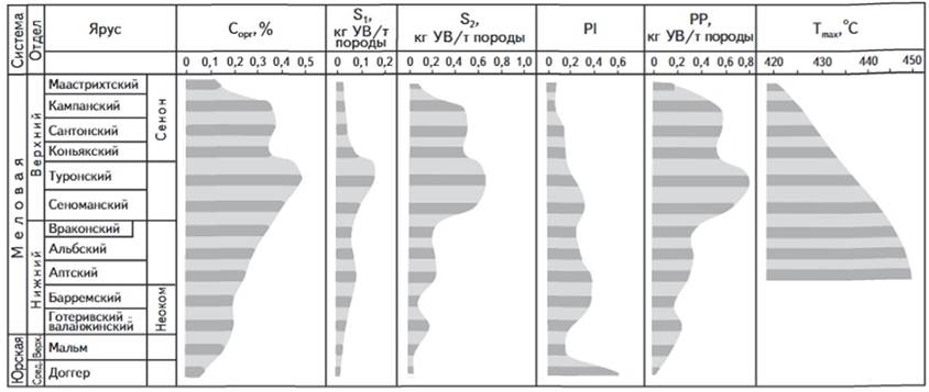 В породах нижней части верхнего мела заметно улучшается весь комплекс параметров ОВ. Так, Сорг и РР глинистых известняков туронского яруса достигают 4-8 % и 40-46 кг УВ/т породы соответственно. Органическое вещество сеноман-турона отличается повышенным водородным индексом (200-600 мг УВ/г Сорг), начальным для нефтегазообразования уровнем катагенеза. При этом значения ИСУ возрастают до 2-16 %.