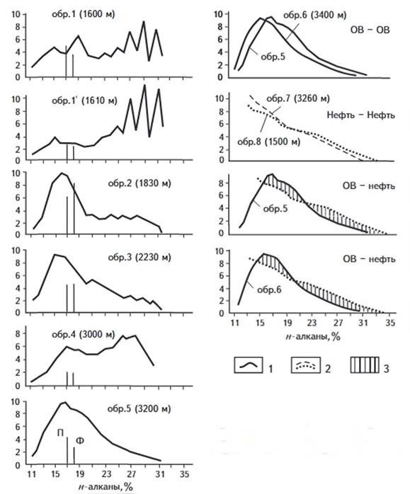 1 хлороформенные битумоиды; 2 нефти; 3 зона расхождения и содержании н-алканов; П пристан (изо-С19), Ф фитан (изо-С20)