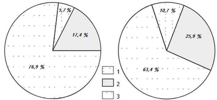 Рис. 3. РАСПРЕДЕЛЕНИЕ ОБЪЕМОВ ДОБЫЧИ НЕФТИ ПО МУН в 1992 г. (А) И С НАЧАЛА ПРОЦЕССА ИХ ПРИМЕНЕНИЯ до 1992 г. (Б)