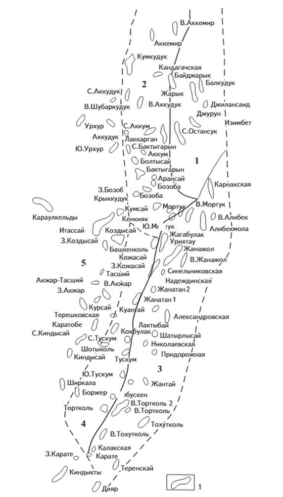 1 структуры; структурно формационные зоны: 1 Остансук-Джурунская, 2 Темирская, 3 Жанажол-Торткольская, 4 Лактыбай-Тускум-Кожасайская, 5 Жаркамысская