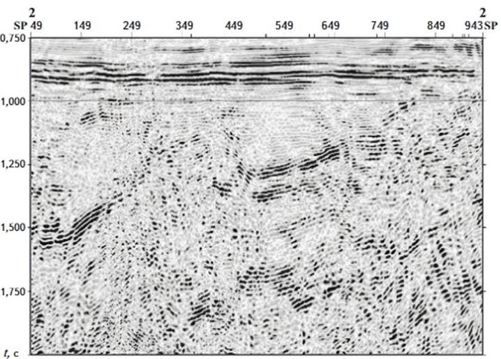 Рис. 2. ВРЕМЕННОЙ СЕЙСМИЧЕСКИЙ РАЗРЕЗ КУЮМБИНСКОГО МЕСТОРОЖДЕНИЯ ПО ПРОФИЛЮ 2-2 (ОТОБРАЖЕНИЕ ПОГРЕБЕННЫХ РИФЕЙСКИХ СТРОМАТОЛИТОВЫХ ПОСТРОЕК В ВОЛНОВОМ ПОЛЕ)