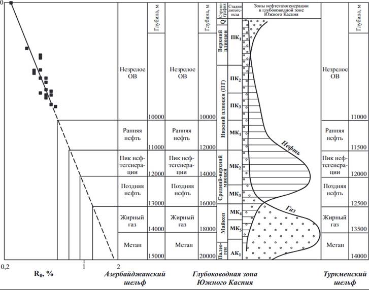 На основе анализа данных [4] прогнозируется также расположение ГФН и ГФГ на туркменском шельфе. Значения R0 здесь составляют 0,6 % на глубине примерно 10,5-11,0 км; 0,77 % - 11,5 км; 0,9 % - 12 км; 1,3 % - 12,5 км; 1,6 % - 13,0-13,5; 2,0 % - 14-15 км. Таким образом, верхняя граница зоны "нефтяного окна” здесь несколько опускается на глубину 10,5-11,0 км.