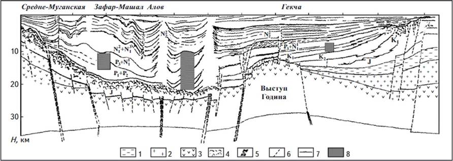 1 - палеозойский фундамент; 2- гранитный слой; 3 - базальтовый слой; 4 - магматические породы мезозоя; 5 - глубинные разломы; 6 - разрывные нарушения; 7- поверхности несогласия; 8- очаг УВ-образования в Южно-Каспийской впадине