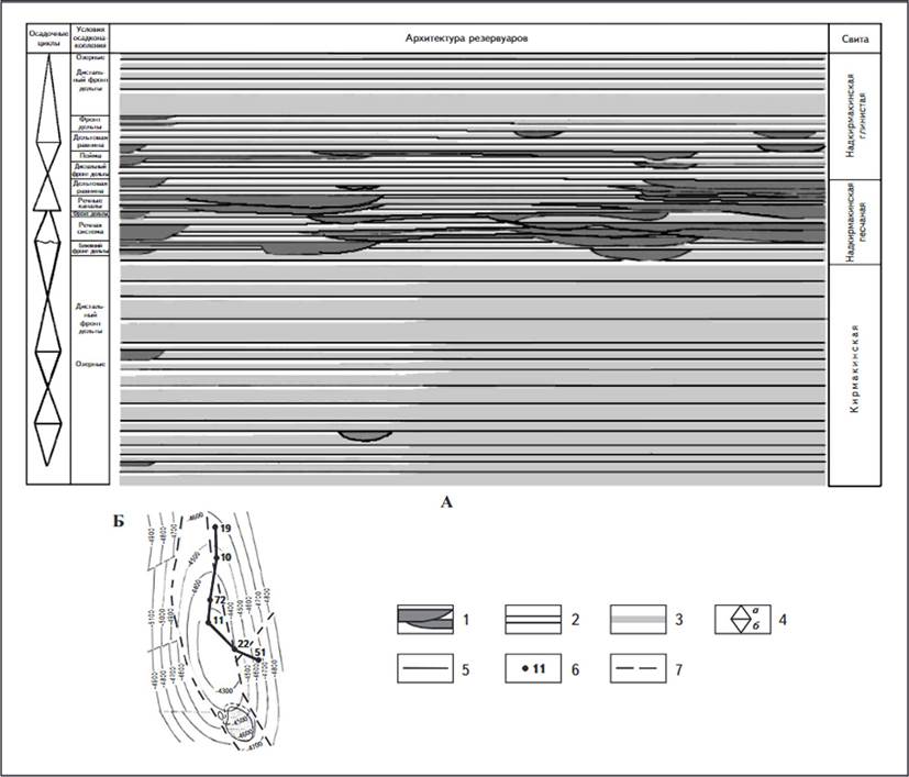 Рис. 6. ОСАДОЧНЫЕ ЦИКЛЫ, УСЛОВИЯ СЕДИМЕНТАЦИИ И АРХИТЕКТУРА РЕЗЕРВУАРОВ КИРМАКИНСКОЙ, НАДКИРМАКИНСКОЙ ПЕСЧАНОЙ И НАДКИРМАКИНСКОЙ ГЛИНИСТОЙ СВИТ (А) И СТРУКТУРНАЯ КАРТА