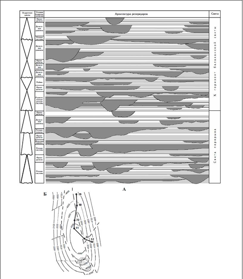 Рис. 7. ОСАДОЧНЫЕ ЦИКЛЫ, УСЛОВИЯ СЕДИМЕНТАЦИИ И АРХИТЕКТУРА РЕЗЕРВУАРОВ X ГОРИЗОНТА БЛЛАХЛНСКОЙ СВИТЫ И СВИТЫ ПЕРЕРЫВА (А) И СТРУКТУРНАЯ КАРТА ПЛОЩАДИ БАХАР ПО ПОДОШВЕ X ГОРИЗОНТА (Б)