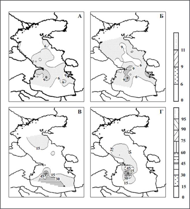 Рис. 9. КАРТЫ РАСПРЕДЕЛЕНИЯ ЗНАЧЕНИЙ БИТУМНОГО КОЭФФИЦИЕНТА, % (А, Б), u NH4/J (В, Г) В ДОННЫХ ОСАДКАХ КАСПИЙСКОГО МОРЯ