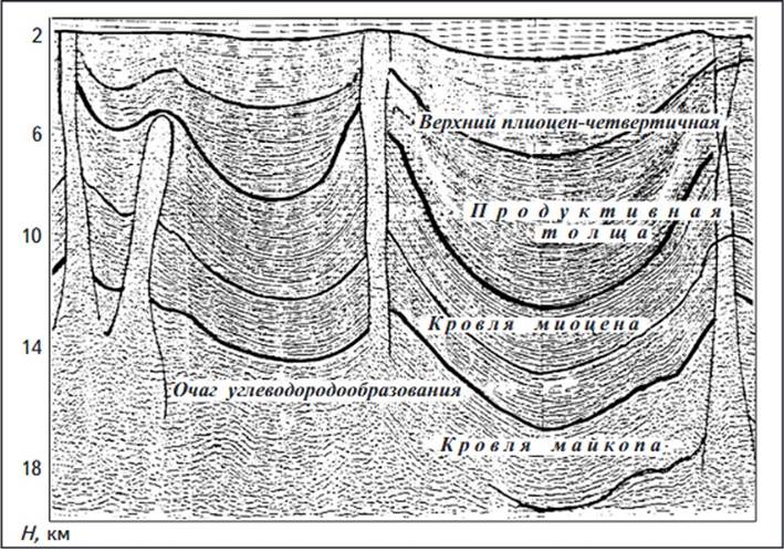 Рис. 5. ПРОГНОЗИРУЕМОЕ ПОЛОЖЕНИЕ ОЧАГОВ УВ-ГЕНЕРАЦИИ НА СЕЙСМИЧЕСКОМ РЕГИОНАЛЬНОМ ПРОФИЛЕ ЧЕРЕЗ ЮЖНО-КАСПИЙСКУЮ ВПАДИНУ (по Мамедову IL, 1991)