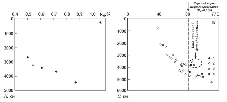 Если исходить из закономерности изменения R0 и Т°С с глубиной (рис. 2), то пик генерации нефти начинается с глубины залегания 3,5-4,5 км. Для выявления зон, благоприятных для максимальной генерации нефти, очень важно знание особенностей залегания нефтематеринских олигоцен-миоценовых отложений, направления их регионального погружения.