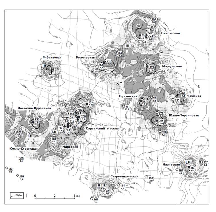 К востоку от рассмотренной надрифовой гряды в сводовых частях локальных поднятий (Терсинского, Южно-Терсинского, Чажского, Староникольского и Назярского) преобладает благоприятный II тип разреза. Эти разрезы характеризуются лучшей сортировкой песчаного материала, что, возможно, связано с переходом от аллювиального к аллювиально-дельтовому типу отложений в бассейновой части исследуемой территории и периодическим перемывом волнениями песчаного материала в пределах поднятий. Соответственно на юге и востоке района повышаются перспективы сводовых частей поднятий. Например, склоновые скв. 59 на Чажском и скв. 178 на Мордовском поднятиях вскрыли неблагоприятный III тип разреза: эффективные толщины пласта Сbb составили всего 0,6 и 1,2 м, к тому же пласт в обеих скважинах оказался водонасыщенным. Однако на вершинах этих локальных поднятий прогнозируемые объекты по данным СВАН оказываются в зонах распространения высокопродуктивных I и II типов разреза, что подтверждает их перспективность.