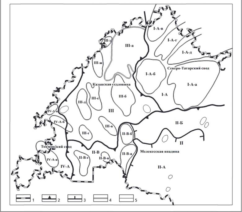 1 - административная граница Татарстана; 2- границы структур I порядка; 3 - границы бортов и склонов; 4 - границы структурных форм II порядка (валов, валообразных зон, котловин); 5 - локальные поднятия в кровле саргаевских отложений; I-A - купольная часть Северо-Татарского свода; валы и валообразные зоны: 1-А-а - Кутлубукашско-Уркушская, 1-А-б - Ковали-Чучинская, 1-А-в - Ципьинская, 1-А-г- Шеморданская, 1-А-а - Кукморская; II - Мелекеская впадина, II-A - осевая зона, II-Б - северная бортовая зона, II-В - западная бортовая зона; валы и валообразные зоны: II-В-а - Буровская, 11-В-б - Пичкасская, II-В-в - Болгарская, II-В-г- Больше-Тарханская; Ш- Казанская седловина, III-а - Казанско-Кировская котловина; валы и валообразные зоны: III-б - Державинско-Столбишенская, III-в - Камско-Устьинская, III-г - Улеминская, III-д - Майдановско-Макуловская, III-е - Матюшинско-Булгарская, III-ж - Сумкинско-Янгааульская, III-з- Казакларская; IV-A - восточный склон Токмовского свода; валы и валообразные зоны: IV-A-a - Карлинская, IV-A-б - Бийская, IV-A-в - Кубнянская