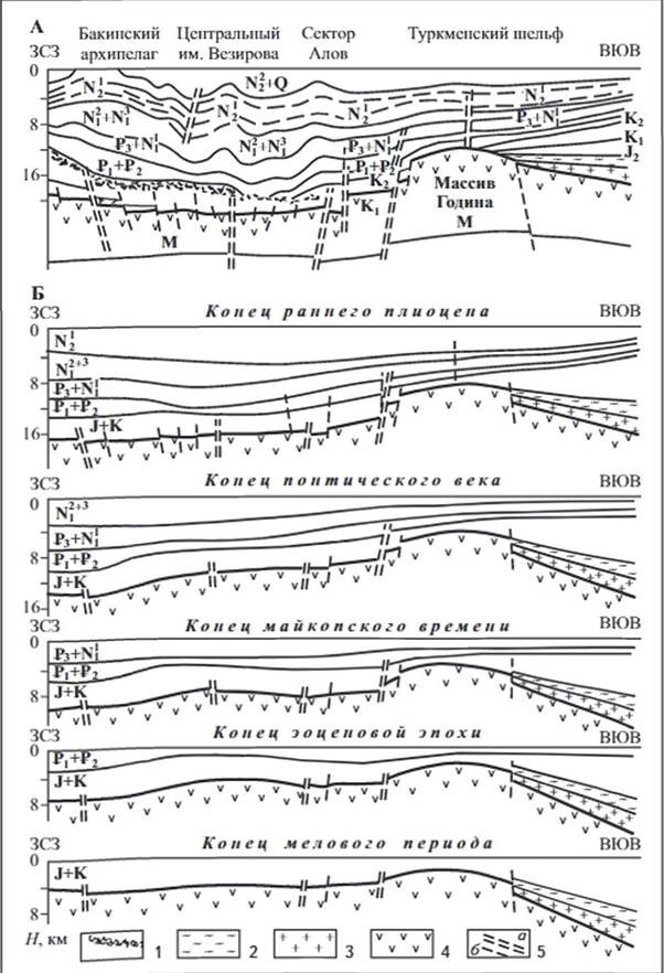 Максимальные мощности мезозойских отложений, залегающих непосредственно на кристаллическом основании, приурочены к Бакинскому архипелагу и восточной прибортовой зоне впадины (см. рис. 1), минимальные - к массиву Година, где они представлены в основном верхнемеловыми породами. Последнее говорит о том, что большая часть массива в течение юры и раннего мела являлась сушей и только с позднего мела он был вовлечен в общее погружение. В пределах Бакинского архипелага мощность мезозойских отложений увеличивается с юга на север. При этом на юге, в районе площади Талыш-дениз, ограниченном погребенными разломами, они отсутствуют (рис. 2). Другой погребенный по палеоцену разлом расположен между поднятиями Кюрдашы и Мугань-дениз. По системе разломов блоки основания ступенчато опускаются в северном направлении, что, очевидно, стимулировало нарастание мощности мезозойских отложений в этом же направлении. В мезозое Южный Каспий состоял из двух суббассейнов, разделенных массивом Година, западный из которых имел две котловины, расположенные в пределах Бакинского архипелага и Центрального сектора (см. рис. 1).
