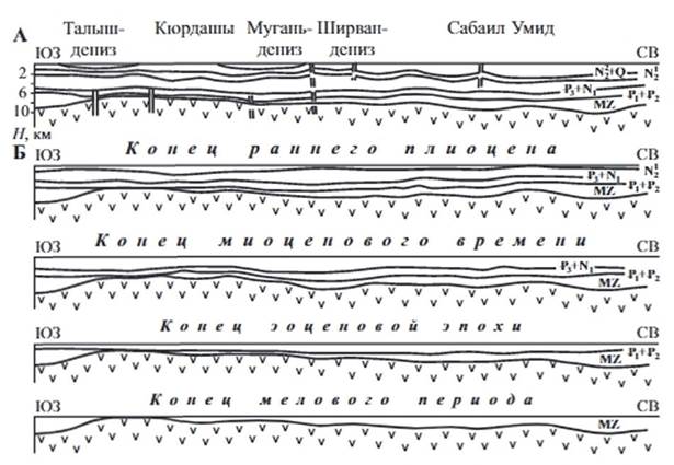 Раздвоенная часть графика характеризует время существования в суббассейне двух котловин. Темпы погружения дна западного суббассейна можно разделить на три этапа. Первый этап длился до конца эоцена и характеризовался в среднем малой скоростью (до 55 м/млн лет) прогибания. Второй этап, охватывающий майкопское время, можно считать переходным. В это время скорость погружения составила более 160 м/млн лет. Третий этап, приходящийся на средний миоцен-четвертичный период, характеризовался резким возрастанием скорости прогибания дна до 800 м/млн лет в среднем, что, очевидно, объясняется также активизацией сжимающих напряжений. Как видно, переходный этап наступил со времени установления режима сжатия в пределах Южно-Каспийской впадины и дальнейшее увеличение скорости прогибания было связано наряду с другими факторами и с возрастанием интенсивности сжимающих напряжений.