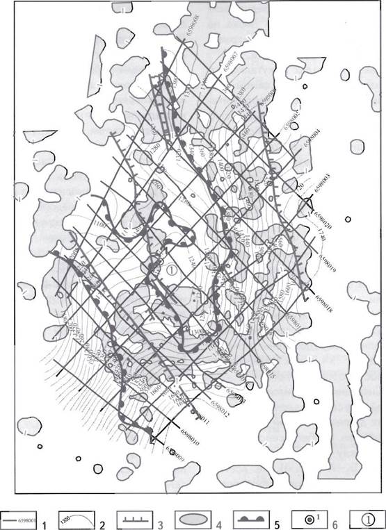 тектонические нарушения; 5 - сейсмические профили; 6 - изогипсы