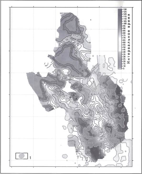 Ситуация становится более понятной при сопоставлении геохимических данных с картой интервальных времен пробега сейсмических волн между отражающими горизонтами Б3-А (рис. 3), т.е. времен пробега сейсмических волн разреза юрских отложений, а следовательно, и мощностей юрских отложений. Все геохимические аномалии расположены в зонах средних и больших значений времени пробега сейсмических волн, т.е. в зонах самых больших и средних мощностей юрских отложений. Сокращение мощности юрских отложений сопровождается исчезновением геохимических аномалий. Это с высокой степенью вероятности указывает на приуроченность залежей УВ к юрским отложениям. При этом ловушки УВ должны быть связаны с выклиниванием пластов-коллекторов в направлении свода Ярхутаяхского поднятия.