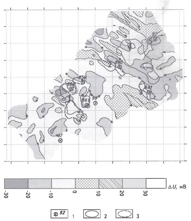 Интенсивность наблюденных аномалий ЕП (рис. 4) над выявленными сейсмическими поднятиями (Степановское, Боярское, Кировское, Западно-Бикчентаевское, Бикчентаевское) изменялось от -10 до -20 мВ. Практически над всеми поднятиями обнаружены геохимические аномалии металлов-индикаторов (Со, Ni, V, Си, Zn и др.) и ореолы УВ-газов. Однако результаты бурения разведочных скважин (92, 840, 841, 859, 860, 861, 99, 47) не подтвердили наличия промышленного скопления УВ в выявленных структурах. Интенсивность аномалии ЕП над нефтеносной структурой ближайшего к Агбязовской площади Дружбинского месторождения достигает -60...-80 мВ. Исходя из этих данных, интенсивность аномалий ЕП -30...-40 мВ над структурами можно считать минимальной, при которой объем УВ может представлять практический интерес. Подобная зависимость характерна для северо-востока Татарстана, на остальных территориях критерии нефтеносности структур по данным ЕП могут быть различными - вплоть до смены знака аномалий ЕП.