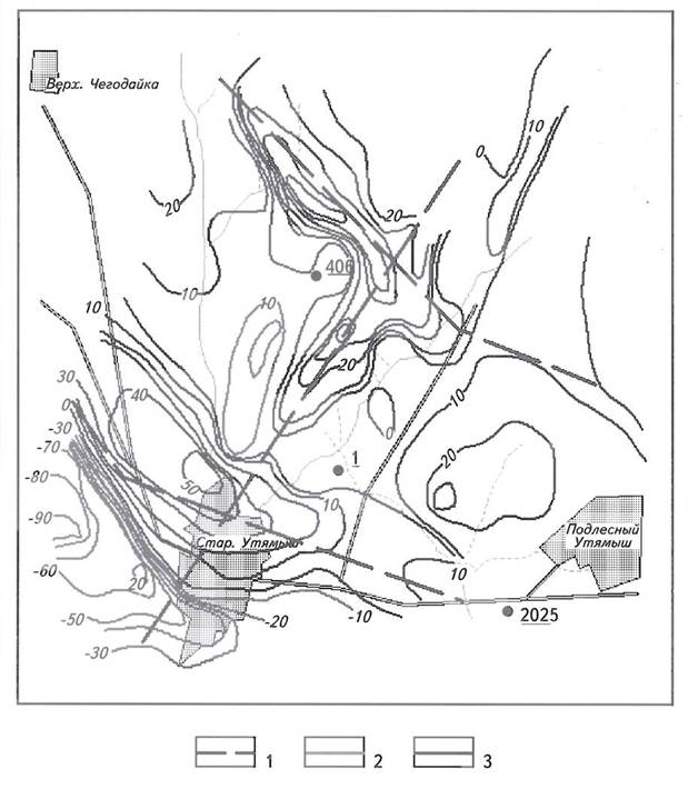 Рис. 5. ПЛАН ИЗОЛИНИЙ ЕП НА ПЛОШАДИ ЧЕГОДАЙСКОГО МЕСТОРОЖДЕНИЯ