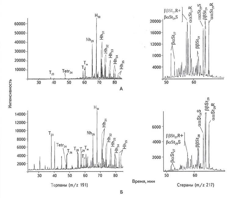 Обусловленные биодеградацией различия прослеживаются и в составе полициклических соединений - стеранов и терпанов (рис. 5).