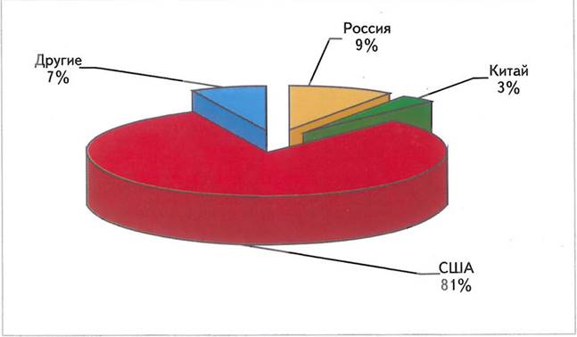 Наиболее мощным нефтегазовым сервисом и практически полным контролем мирового сервисного рынка обладают компании США (см. рис. 2), далее идет Россия, нефтегазовый сервис которой в советское время самостоятельно справлялся с обеспечением рекордных годовых уровней добычи нефти в 600 млн т и газа в 600 млрд м3. Помимо своей страны он успешно работал в странах СЭВ, Китае, Вьетнаме, Индии, Ираке, Египте, Ливии, Алжире, Кубе, Югославии и других. Китайский нефтегазовый сервис - самый молодой и интенсивно развивающийся. Он не только самостоятельно обеспечивает потребности нефтегазовой отрасли своей страны, но и активно укрепляет позиции на мировой арене.