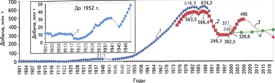 добыча нефти возросла в 54 раза (1928 г. - 11,5 млн т, 1987 г. - год максимальной добычи - 624,3 млн т).