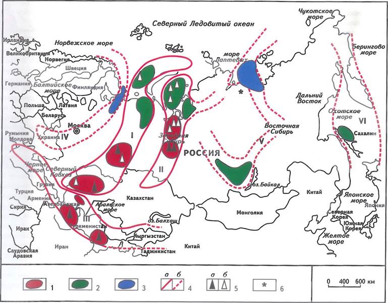 Центры (полюса) нефтегазонакопления: 1 - установленные и освоенные, 2- выявленные, но в полной мере не освоенные, 3 - прогнозируемые; 4 - контуры поясов нефтегазонакопления: а - установленные (I- Баренцево-Каспийский, II-Западно-Сибирский, III- Кавказско-Памирский), б-прогнозируемые (IV- Среднерусский, V- Восточно-Сибирский, VI- Восточно-Азиатский); 5- некоторые наиболее крупные месторождения нефти (а) и газа (б); 6- Оленекское месторождение битумов