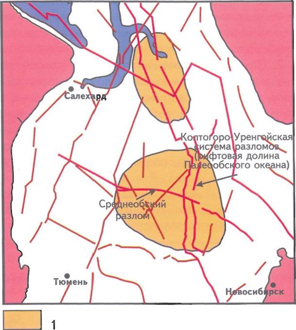 3. Важную, а в ряде случаев и определяющую, роль в формировании узлов (полюсов) нефтегазонакопления могут играть крупные разломы земной коры. Наиболее благоприятные условия для образования аномально больших концентраций нефти и газа могут возникать в узлах пересечения крупных разломов (Гаврилов В.П., 1975). Так, субмеридиональная Колтогорско-Уренгойская система разломов Западной Сибири, являющаяся осью Палеообского океана, пересекается субширотным Среднеобским разломом. С этим пересечением совпадает положение крупнейшего по запасам Среднеобского полюса нефтегазонакопления (рис. 3).