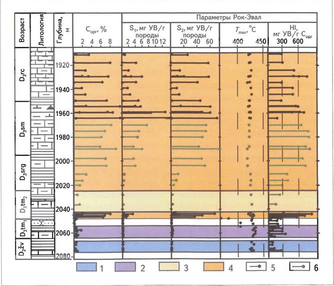 Для картирования материнских толщ используются геохимические разрезы скважин, построенные по результатам изучения керна (шлама) с учетом данных ГИС. В настоящее время основным аналитическим методом, применяемым для составления геохимических разрезов, является метод Рок-Эвал, позволяющий быстро проанализировать большое число образцов, что значительно повышает надежность выделения, картирования и оценки генерационного потенциала материнских толщ. Пример фрагмента геохимического разреза скважины, составленного по результатам исследований ВНИГНИ по Мелекесской впадине, приведен на рис. 1. В случае отсутствия образцов пород концентрацию Сорг и другие материнские характеристики отложений можно спрогнозировать, используя данные ГИС и установленные корреляции между геохимическими и литологическими типами пород в изученном интервале разреза. В частности, на рис. 1 из-за отсутствия керна наличие очень хороших материнских пород в интервале 1970-2040 м было спрогнозировано до проведения анализов. Выполненные позже исследования специально подобранной коллекции шлама из этого интервала полностью подтвердили сделанный ранее прогноз.