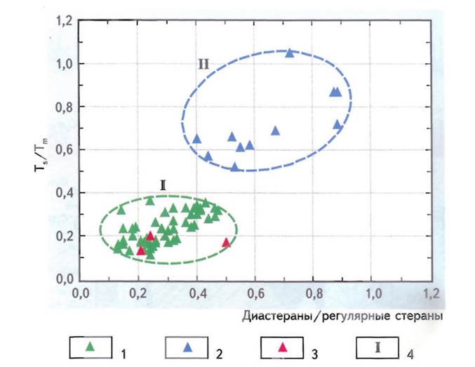 Рис. 4. ДИФФЕРЕНЦИАЦИЯ НЕФТЕЙ ЮЖНО-ТАТАРСКОГО СВОДА ПО БИОМАРКЕРНЫМ ПАРАМЕТРАМ