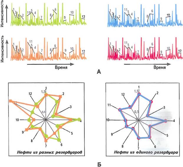 Для этих целей наиболее часто используется анализ вариаций индивидуального УВ-состава нефтей и конденсатов, определяемого с помощью ГХ- или ГХ-МС-исследований. В основе существующих геохимических методов лежит закономерность, установленная на многих месторождениях. Она заключается в том, что различия нефтей в пределах месторождения по параметрам УВ-состава, как правило, вызваны разобщенностью резервуаров или отдельных участков сложнопостроенного резервуара, что препятствует перемешиванию флюидов. В едином резервуаре таких различий не наблюдается. Использование относительно простых и недорогих геохимических методов помогает выявлять особенности строения резервуаров, контролировать процессы испытания и эксплуатации скважин, тем самым оптимизируя разведку и разработку месторождений.