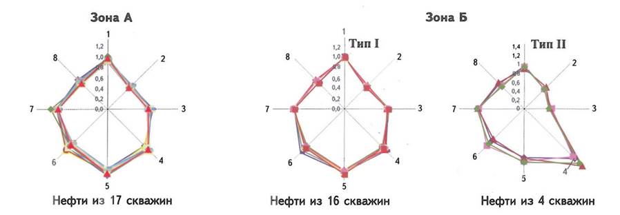 На рис. 8 показаны результаты проведенных во ВНИГНИ анализов нефтей пермокаменноугольной залежи на одном из месторождений в Тимано-Печорской НГП. На основании литолого-фациальных исследований установлены значительные различия в строении карбонатного резервуара в разных зонах залежи. В восточной части залежи (зона А) он относительно однороден, а в западной (Б) характеризуется сильной латеральной и вертикальной изменчивостью, связанной с наличием большого числа глинистых пластов в карбонатном резервуаре. Целью геохимических исследований было получение информации о флюидосообщаемости пород-коллекторов в пределах залежи. Для этого было исследовано несколько десятков образцов нефтей из разных зон залежи. Полученные результаты показали идентичность звездных диаграмм всех изученных нефтей из зоны А и многих образцов из зоны Б (тип I), что свидетельствует о хорошей вертикальной и латеральной флюидосообщаемости пород-коллекторов в пределах большей части залежи. Наряду с этим, в ряде скважин из зоны Б получены нефти, заметно отличающиеся от основной массы образцов по конфигурации звездных диаграмм (тип II). Наблюдаемая “аномальность” состава нефтей дает основание предполагать наличие в пределах пермокарбонового резервуара отдельных изолированных участков, которые необходимо локализовать для рационализации разработки залежи