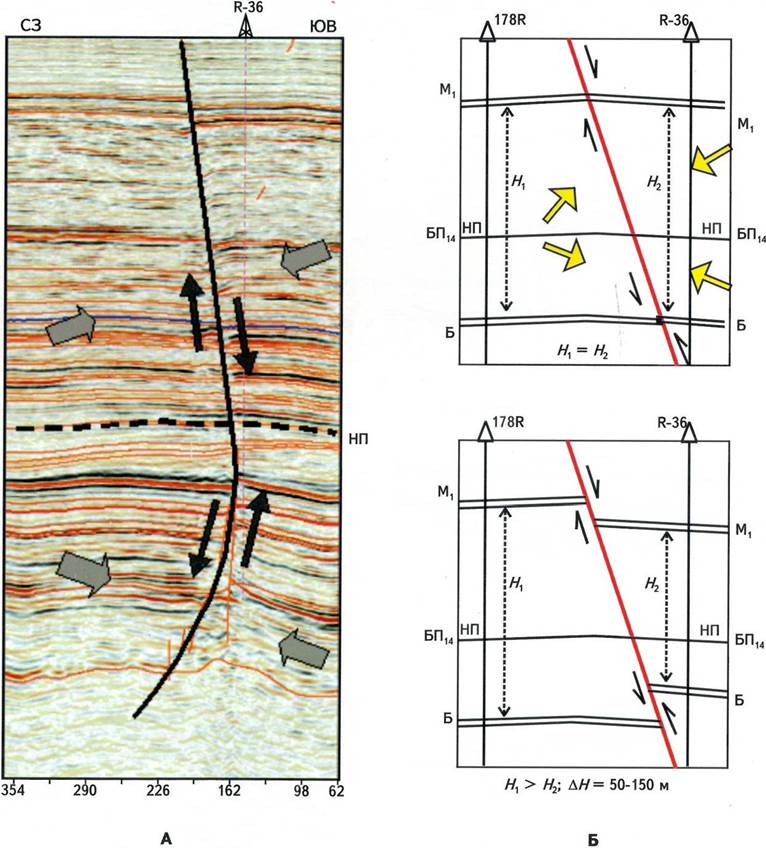 В ряде случаев внутри клина сжатия отмечается поднятие нижней части разреза (юра), которое происходит по схеме взбрасывания приразломных блоков. Такое строение разломов придает им сложную природу с переменной сбросо-взбросовой кинематикой по падению. На Еты-Пуровской площади нами впервые выявлен реверсный тип разломов (рис. 7 см. на цветной вкладке). Свойства таких разломов определяются разнонаправленными движениями блоков по одну сторону от сместителя ниже и выше нейтральной поверхности, связанной с горизонтами ачимовской толщи. Если выше ачимовской толщи разлом классифицируется как сброс, то ниже этой поверхности он трансформируется во взброс, при этом по одну сторону плоскости сместителя пласты смещаются навстречу друг другу, а по другую - расходятся друг от друга. На уровне горизонтов ачимовской толщи смещение пластов нулевое, вверх по разрезу смещение растет со сбросовой кинематикой и на уровне горизонта М1 (верхний мел) составляет 40 м, вниз по разрезу смещение также растет, но уже со взбросовой кинематикой, и на уровне горизонта Б составляет 20 м. Следствием таких деформаций является разница мощности толщи Б-М1 по разные стороны от сместителя в 60 м.