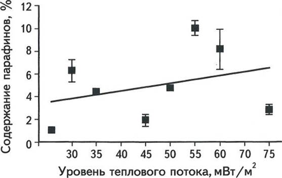Рис. 5. ИЗМЕНЕНИЯ СОДЕРЖАНИЯ ПАРАФИНОВ В НЕФТЯХ В ЗАВИСИМОСТИ ОТ УРОВНЯ ТЕПЛОВОГО ПОТОКА