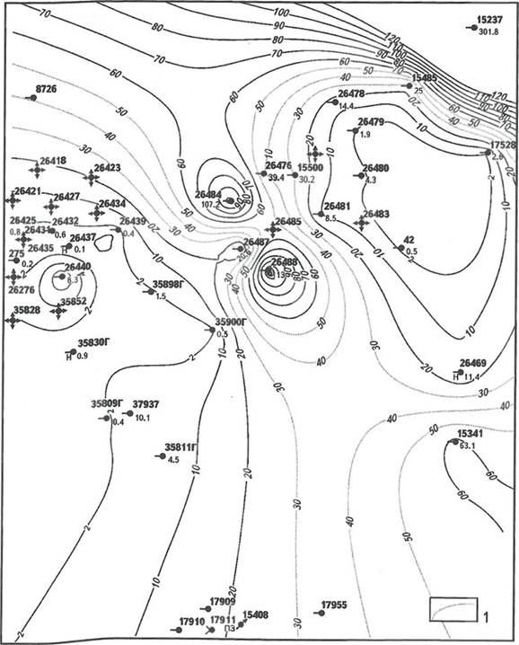 1 - изолинии с невысокой раскрытостью трещин, см*10 2