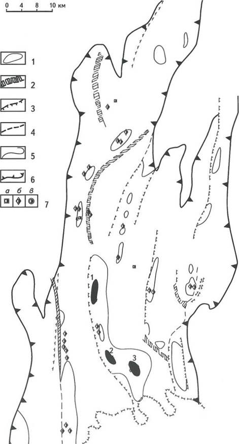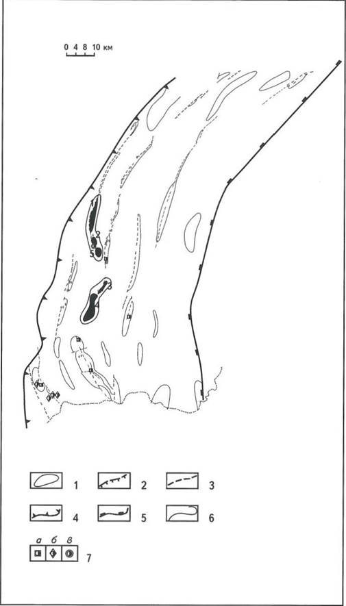 А - Сурханларьинский мегапрогиб: граница: 1 - Афгано-Таджикской впадины, 2 - тектонических элементов; 3 - нефтяные месторождения: 1 - Миршады, 2- Коштар, 3- Дяльми- кар, 4 - Джалаир, 5- Хаудаг, 6 - Кокайты, 7- Актау, 8-Учкызыл, 9-Джейранхона, 10-Корсаглы, 11 - Амударья, 12- Южная Курганча; структуры: 4 - выявленные, 5- предполагаемые; Б - Вахшский прогиб: 1 - контуры структур; 2 - флексурно-разрывные зоны; 3 - взбросы и взбросонадвиги; 4 - прочие разрывные нарушения; 5- зона нефтегазонакопления; 6 - граница Вахшского прогиба; 7- скважины: а - параметрические, б - поисковые, в - разведочные; месторождения: 1 - Кызыл-Тумшук, 2 - Акбаш-Адыр, 3 - Кичик-Бель; В- Кулябский мегапрогиб: 1 - контуры структур; .2- взбросы и взбросонадвиги; 3- прочие разрывные нарушения; граница: 4 - Кулябского прогиба, 5 - Афгано-Таджикской впадины; 6-зона нефтегазонакопления; 7-скважины: а-параметрические, б - поисковые, в - разведочные; месторождения: 1 - Бештентяк, 2 - Сульдузы, 3 - Южный Пушион, 4 - Ходжасартис, 5 - Узунохор