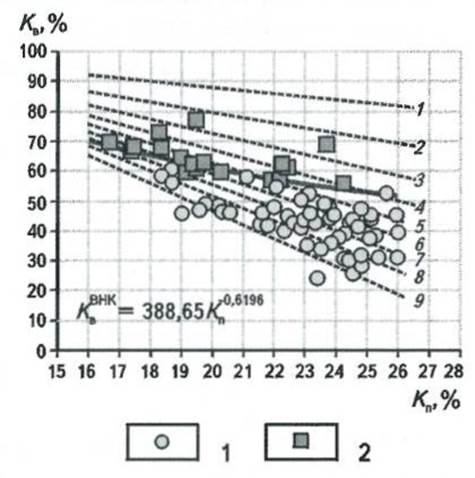 1 - нефть; 2- вода; значения h, м: 1 - 2,2-4, 3-6, 4-8,5-10,6-12, 7 15, 8- 20; 9- Кво = f(Кп)