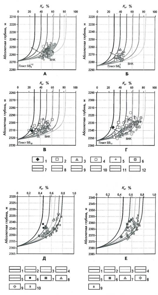 А-Г: значения Кп, %: 1 - 15-17; 2 - 17-19; 3- 19-21; 4 - 21-23; 5-23-25; 6-25-27; 7- 16; 8- 18; 9-20; 10- 22; 11 - 24; 12 - 26; Д - нефтенасышенность, %: 1 - 18; 2- 19; 3- 20; 4 - 21; 5-22; 6-< 18,5; 7- 18,5-19,5; 8-19,5-20,5; 9-20,5-21,5; 10-> 21,5; Е - нефтенасышенность, %: 1 - 18; 2 - 19; 3 - 20; 4 - 21; 5 - 22; 6 - 18,5-19,5; 7- 19,5-20,5; 5-20,5-21,5; 9 - > 21,5; точки соответствуют определениям по керну, линии рассчитаны по формуле значений Кв; абсолютные отметки ЗЧВ для пластов БВ91-2, БВ93, БВ101-2, БВ11 и БВ101, БВ102 приняты значения 2268, 2285, 2324, 2353 и 2359, 2380 м соответственно