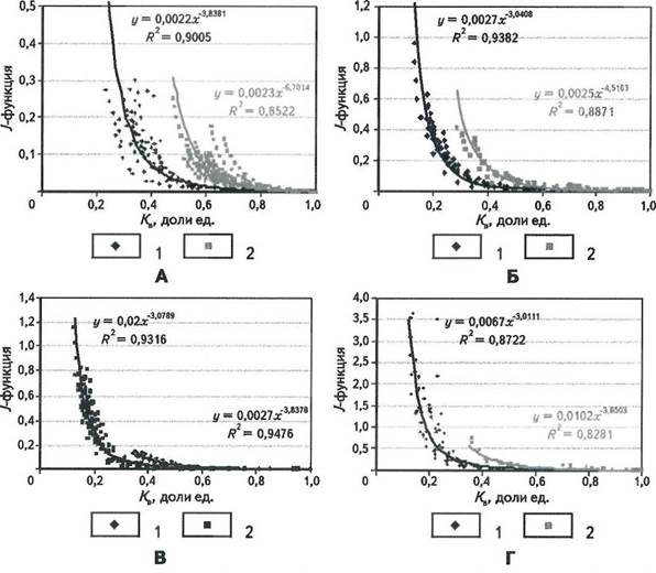 Рис. 4. ГРАФИКИ ЗАВИСИМОСТЕЙ J-ФУНКЦИИ ОТ ВОДОНАСЫЩЕННОСТИ ПО РЕЗУЛЬТАТАМ КАПИЛЛЯРИМЕТРИИ ДДЯ ПЛАСТОВ AB11-2 (А), АВ13 (Б), АВ2-3 (В), АВ4-5 (Г) САМОТЛОРСКОГО МЕСТОРОЖДЕНИЯ