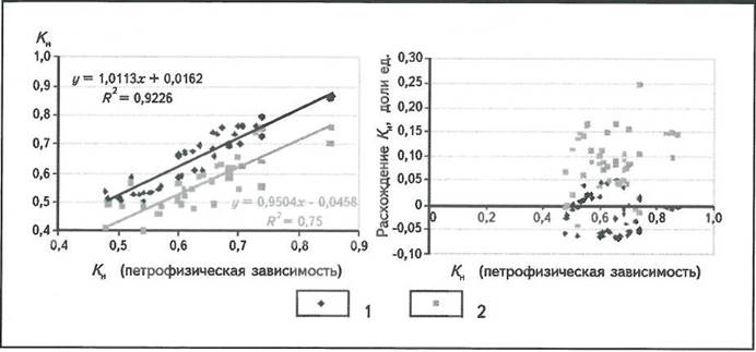 Рис. 5. СОПОСТАВЛЕНИЕ РАСЧЕТОВ (А) И ОЦЕНКА ВЕЛИЧИНЫ РАСХОЖДЕНИЙ (Б) КОЭФФИЦИЕНТА НЕФТЕНАСЫЩЕННОСТИ (Кн) ПО J-ФУНКЦИИ (1) И МОДЕЛИ ПЕРЕХОДНОЙ ЗОНЫ (2) СО СКВАЖИННЫМИ ДАННЫМИ