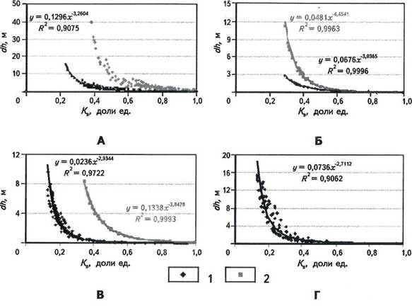 Рис. 6. ГРАФИКИ ЗАВИСИМОСТЕЙ ВЫСОТЫ ПЕРЕХОДНОЙ ЗОНЫ ОТ ВОДОНАСЫШЕННОСТИ ДЛЯ ПЛАСТОВ АВ11-2 (А), АВ13 (Б), АВ2-3 (В), АВ4-5 (Г) САМОТЛОРСКОГО МЕСТОРОЖДЕНИЯ