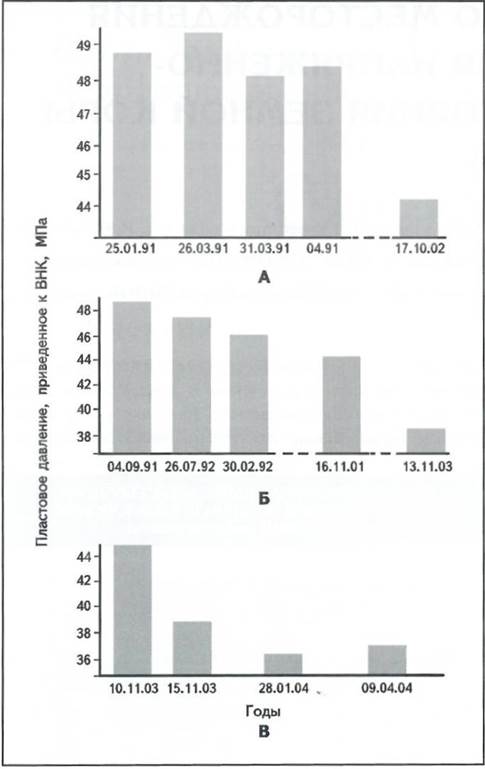 Рис. 2. ДИНАМИКА ПРИРОДНОГО ПЛАСТОВОГО ДАВЛЕНИЯ В КИЗЕЛОВСКОЙ ЗАЛЕЖИ В ФОНТАННЫХ СКВ. 1 (А). 2 (Б) и 3 (В)